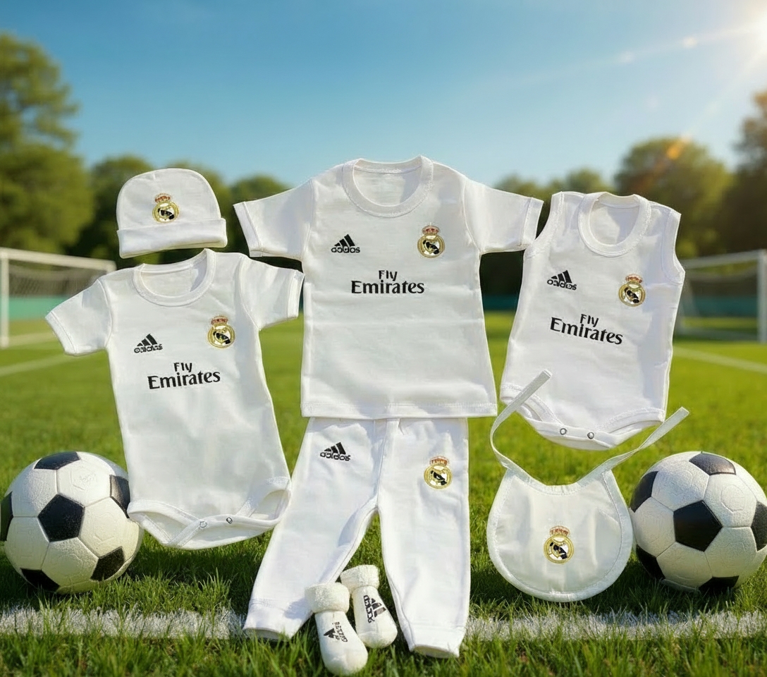 طقم رضّع فاخر مكوّن من 7 قطع بشعار ريال مدريد،